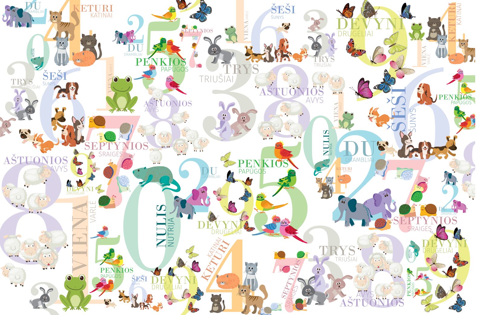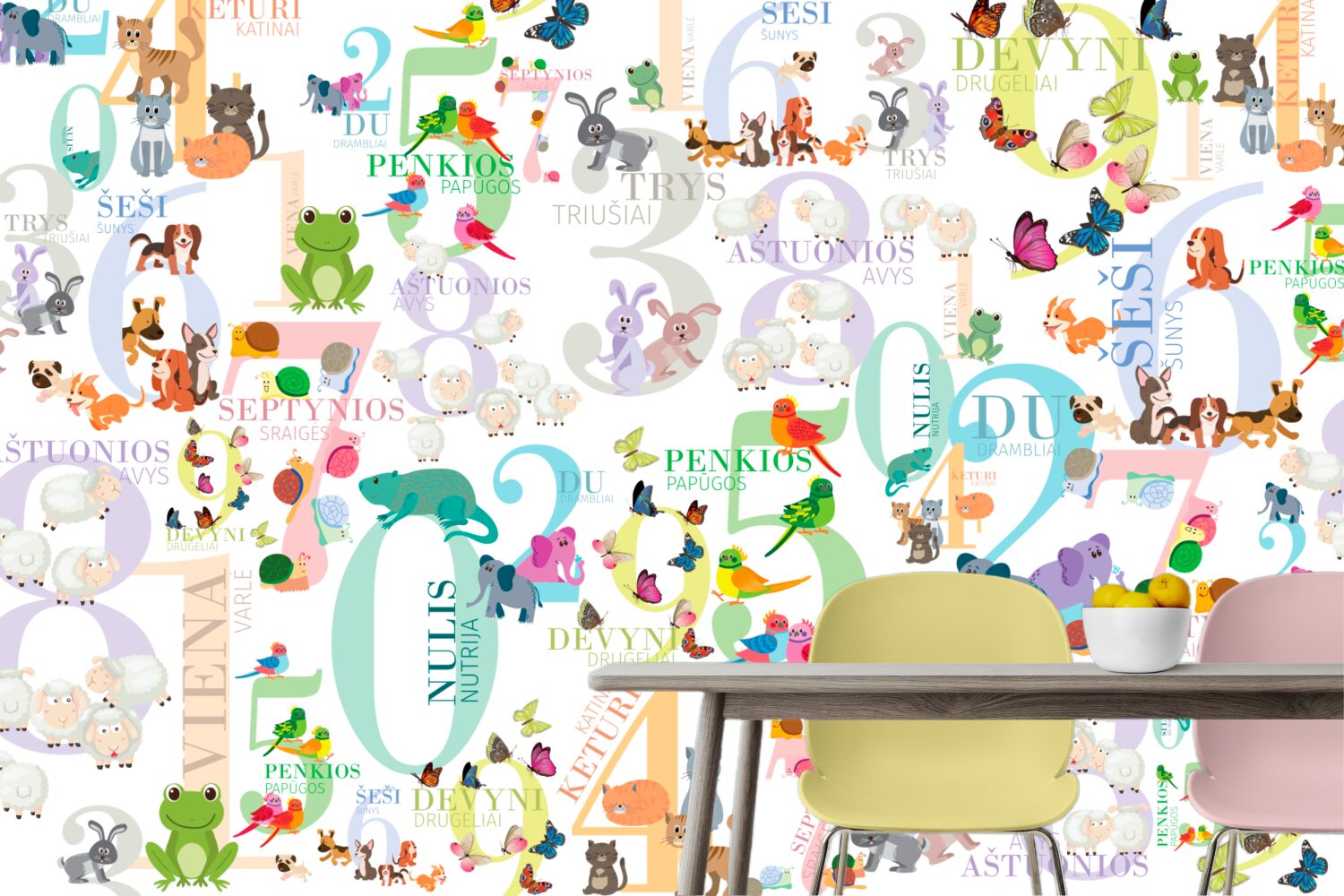 Karikatūrinio stiliaus fototapetas yra puikus pasirinkimas vaikų klasėms, nes padeda mokytis skaičiuoti, derinant skaičius su gyvūnų paveikslėliais bei tekstu.